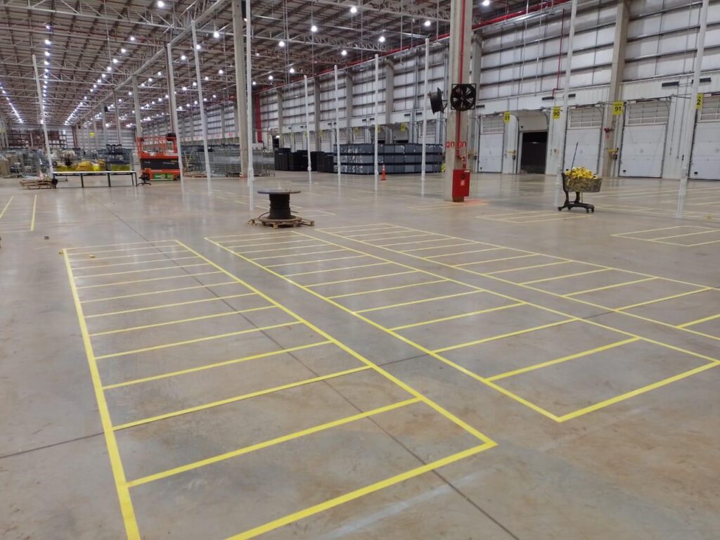 Demarcação no piso com tinta industrial de alta durabilidade para organização de tráfego interno e externo, áreas de circulação, faixas de pedestre, setas e áreas de segurança.