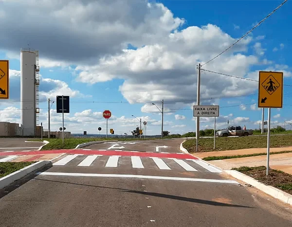 Placas de sinalização metálicas ou em PVC para orientação e segurança viária interna. Indicadores de tráfego, alertas de risco, velocidade e proibições. Fixadas em parede ou poste, conforme layout do cliente.